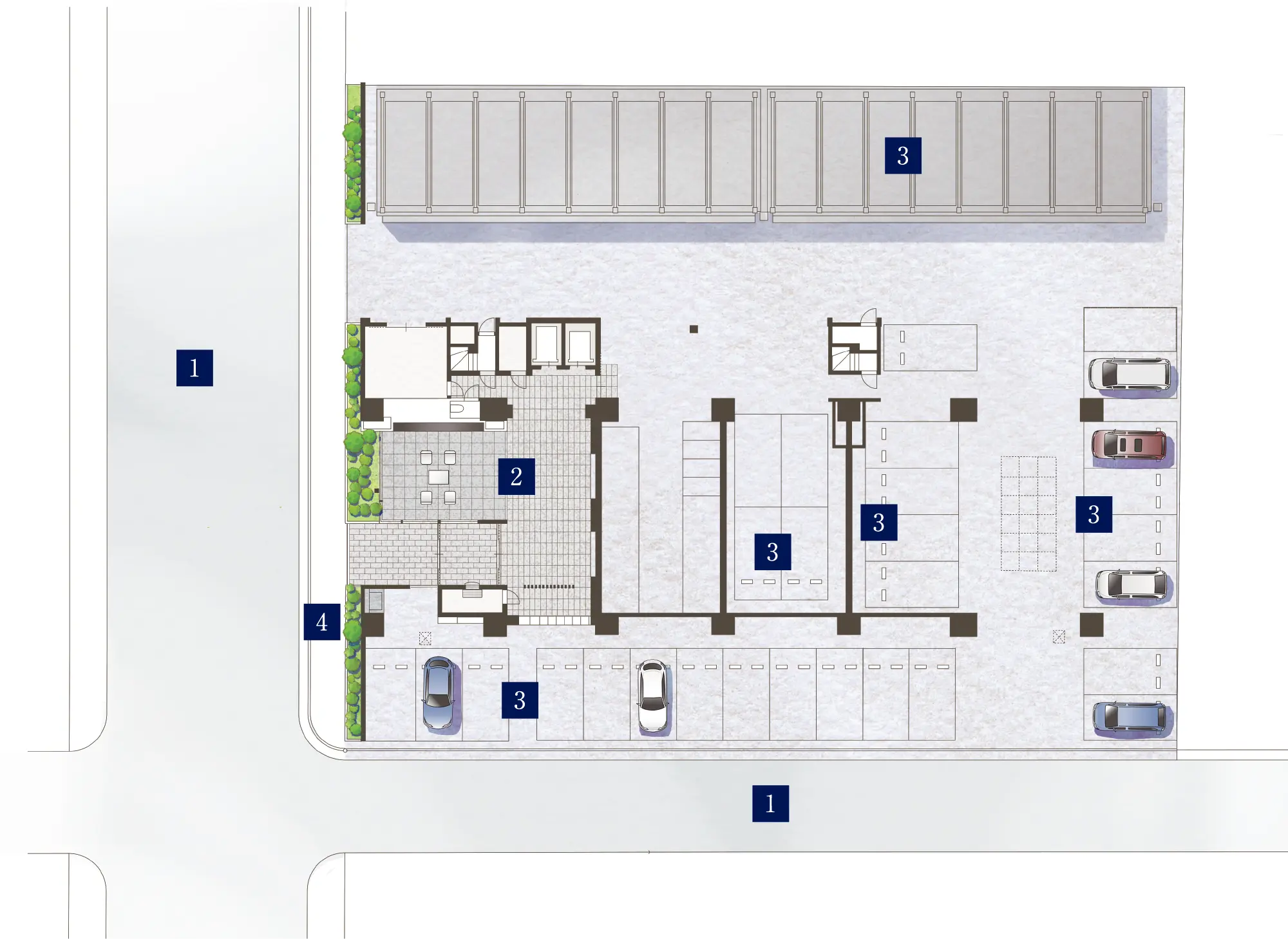 駐車場は平面と機械式で86台分(縦列2台含む)(設置率102%)を設けています。