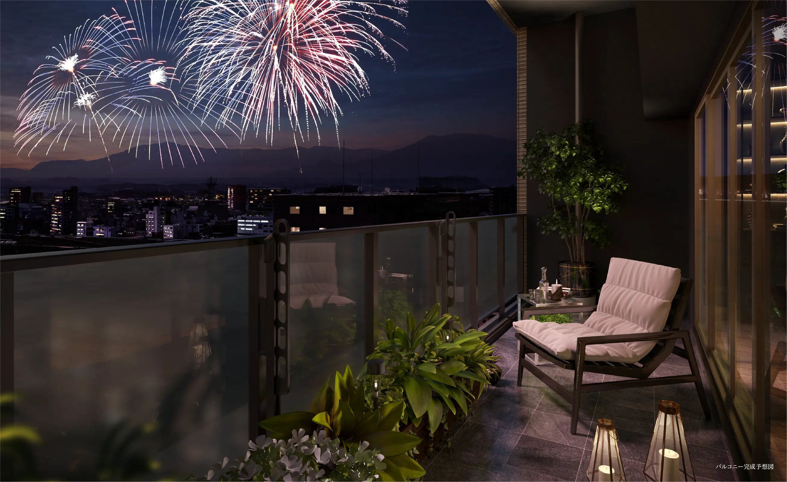 ※掲載のバルコニー完成予想図は、現地最上階相当の高さより南西方向を撮影した写真(2023年6月)に計画段階の図面を基に描き起こした建物完成予想図を合成し、CG加工したもので、実際とは異なります。